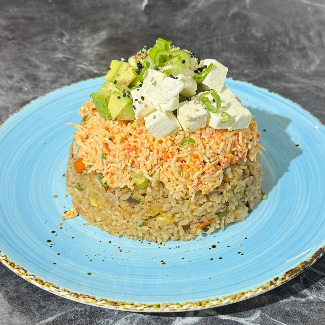 arroz frito con huevo, res, camarón, pollo y vegetales mixtos cangrejo spicy, aguacate y queso crema