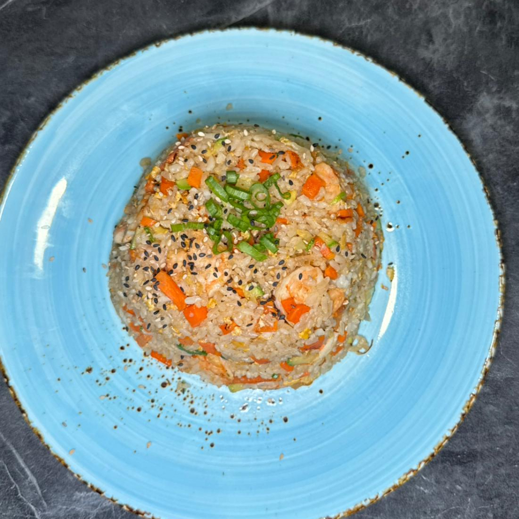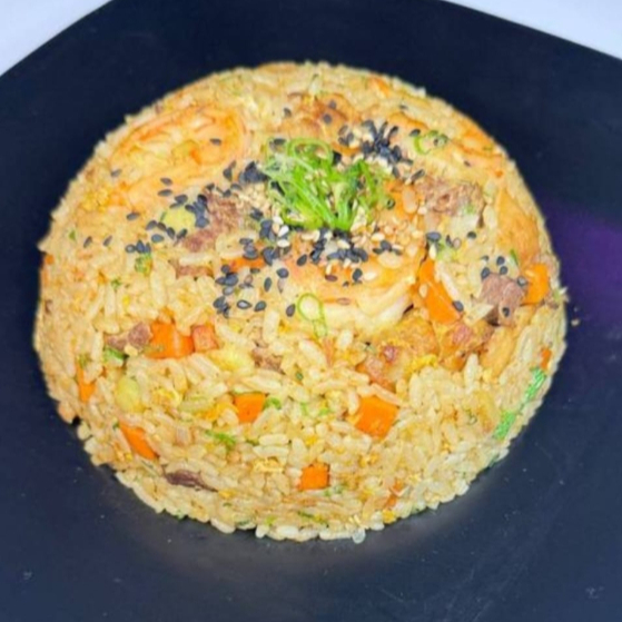 arroz frito con huevo, res, pollo, camarón y vegetales