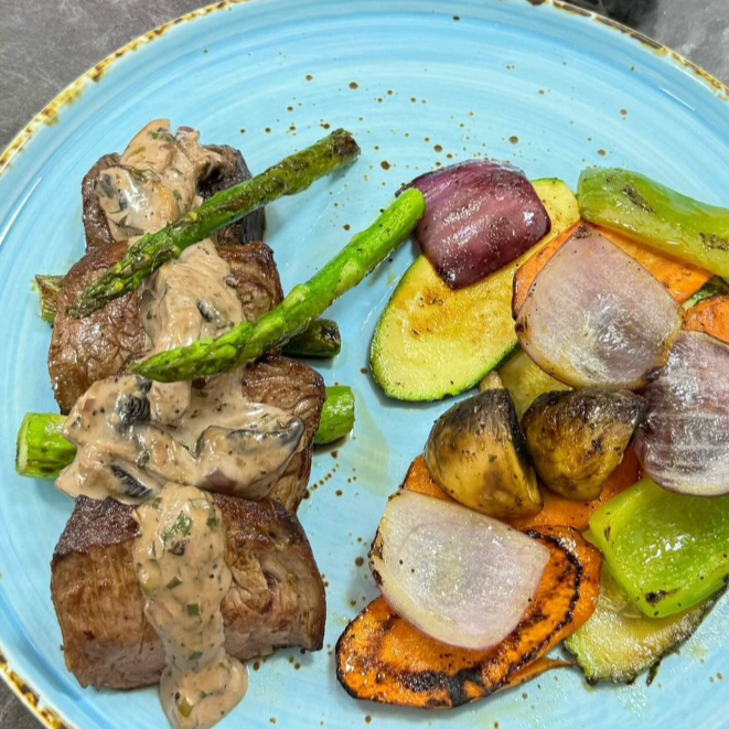Filete de res a la plancha, bañado en una reducción al vino tinto, acompañado de vegetales mixtos y arroz blanco.