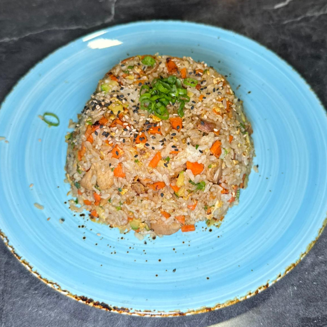 arroz frito con huevo pollo y vegetales