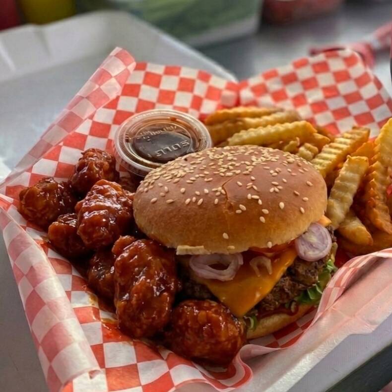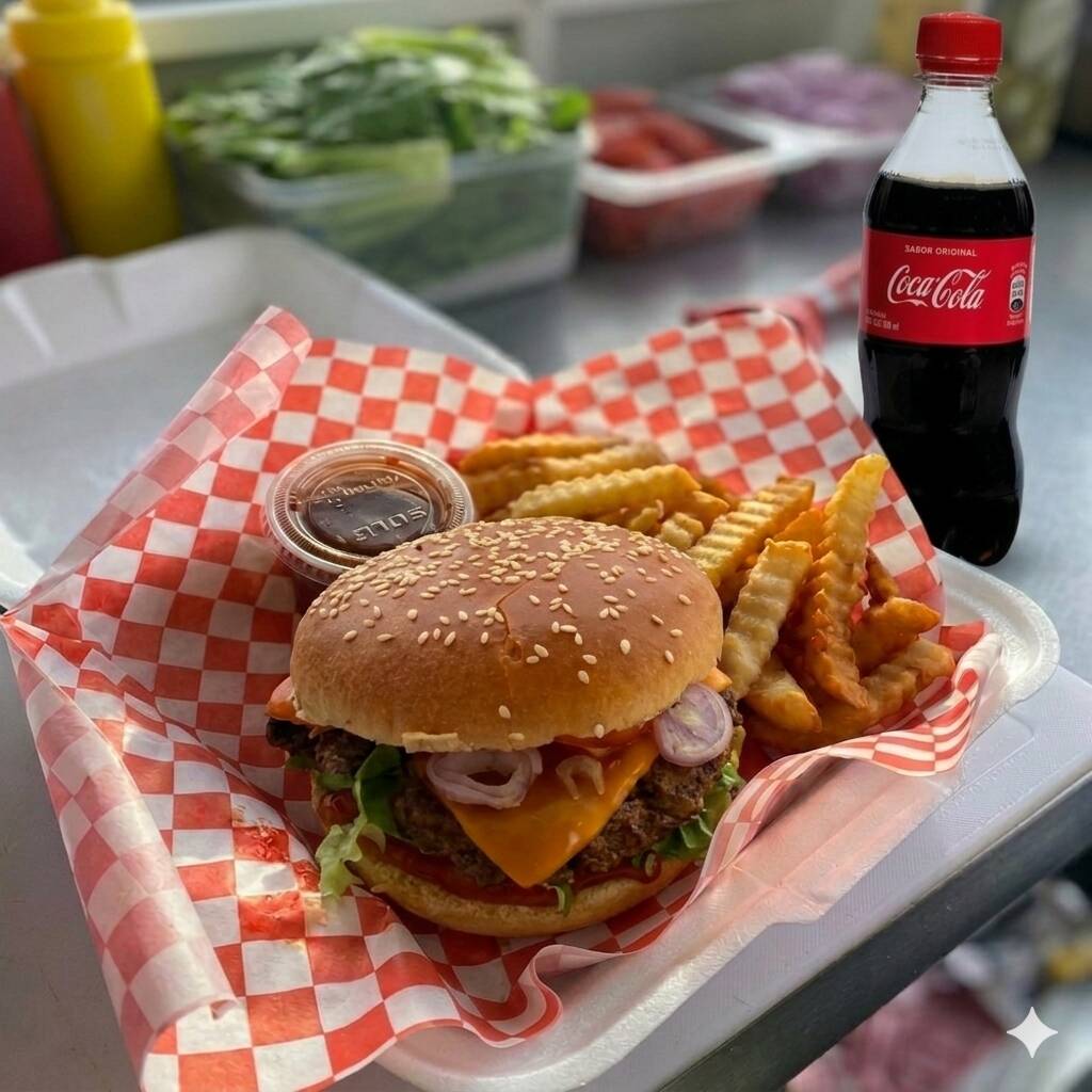 HAMBURGUESA (res o Chicken tender) + BONELESS (6pz) + PAPAS. OJO (la presentación de las papas puede variar según la disponibilidad de la tienda, la presentación de la bebida puede variar según la