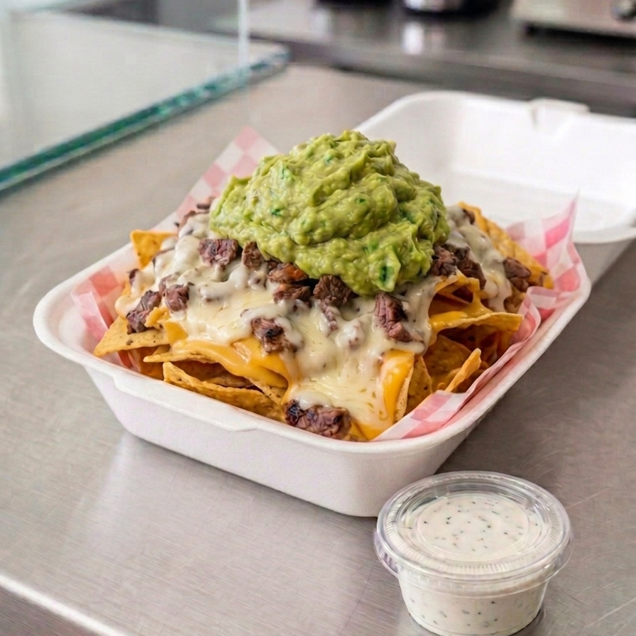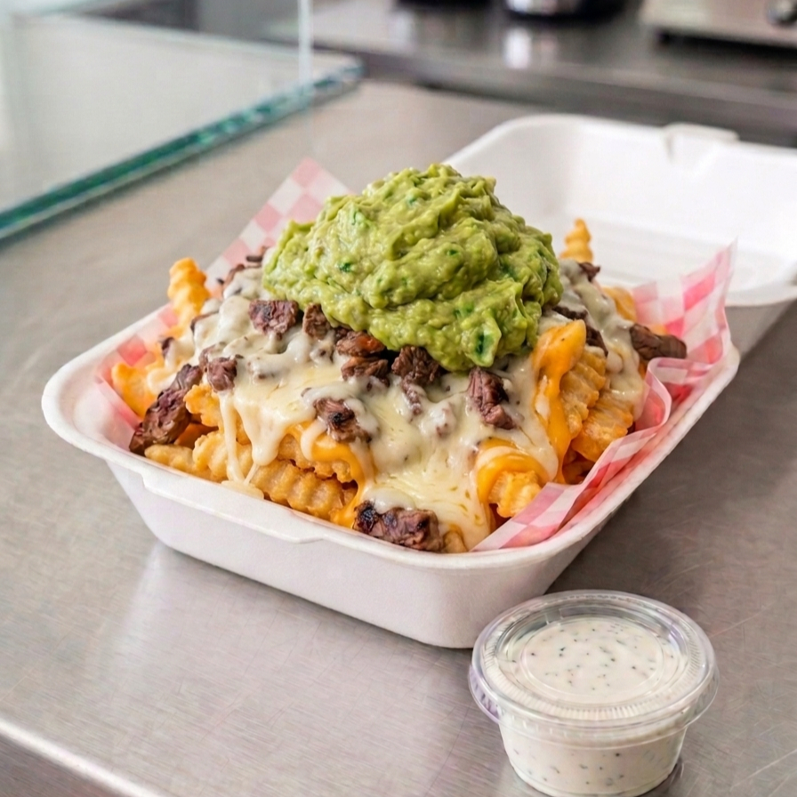 Papas bañadas en queso, carne asada, queso monterrey, guacamole, salsa y aderezo de chipotle. OJO (solo guacamole y salsa se manda por separado).