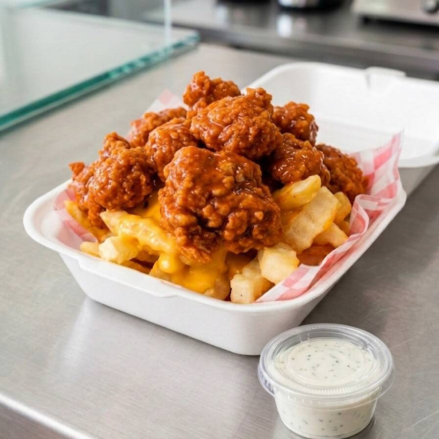 *Chicos (6x6)Papas bañadas en queso para nachos + 6 boneless (salsa a elegir) aderezo chipotle y ranch se mandan aparte