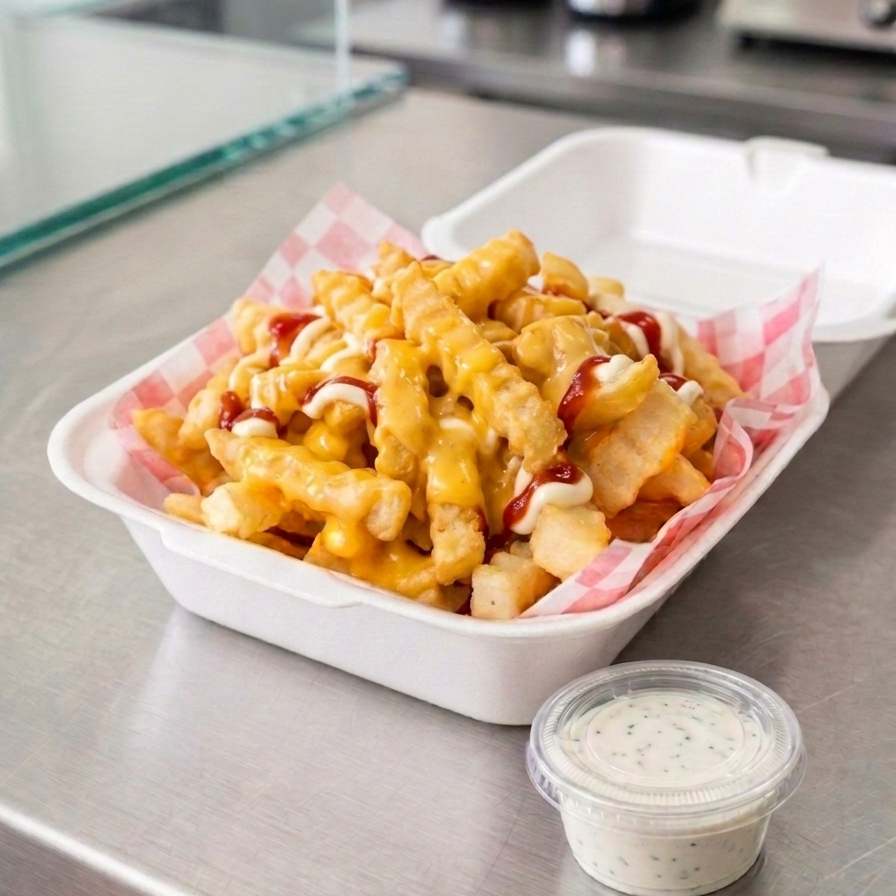 Orden CHICA de papas fritas, Catsup, Aderezo de Chipotle y Queso. OJO (la presentación de la papa puede variar según la disponibilidad de tienda). Charola 6x6
