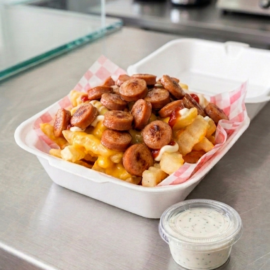 Papas bañadas en queso de nacho + salchicha, catsup y aderezo de chipotle. OJO ( el platillo se manda ya prepara, bañado y decorado con sus respectivas salsas).