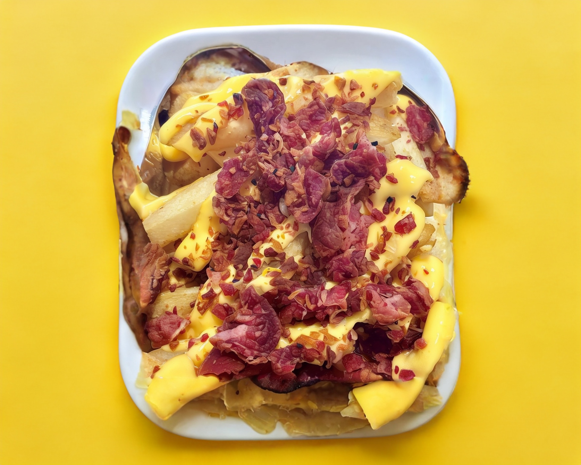 300 grs de Papas a la francesa + tocino + queso cheddar + catsup + veggies.