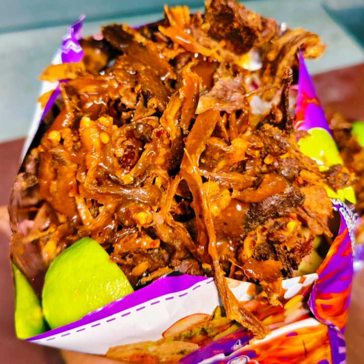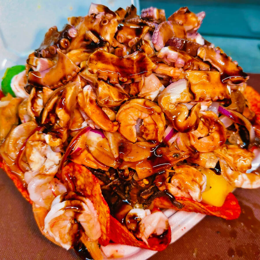 Tostitos, pepino, jicama, cueritos, cachuates, chaca chaca, mango, carne seca, camarón seco, aguachile, camarón cocido y pulpo.