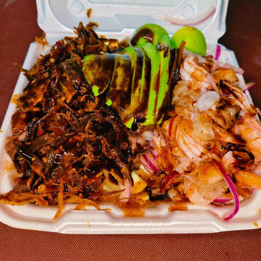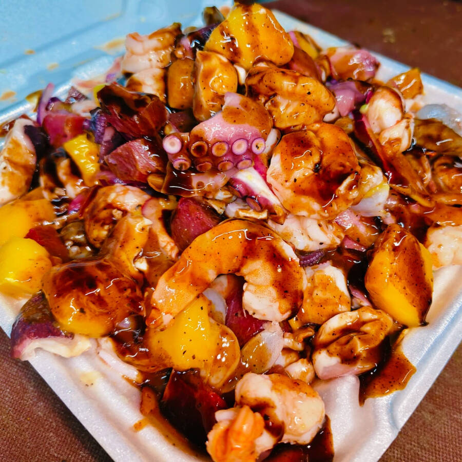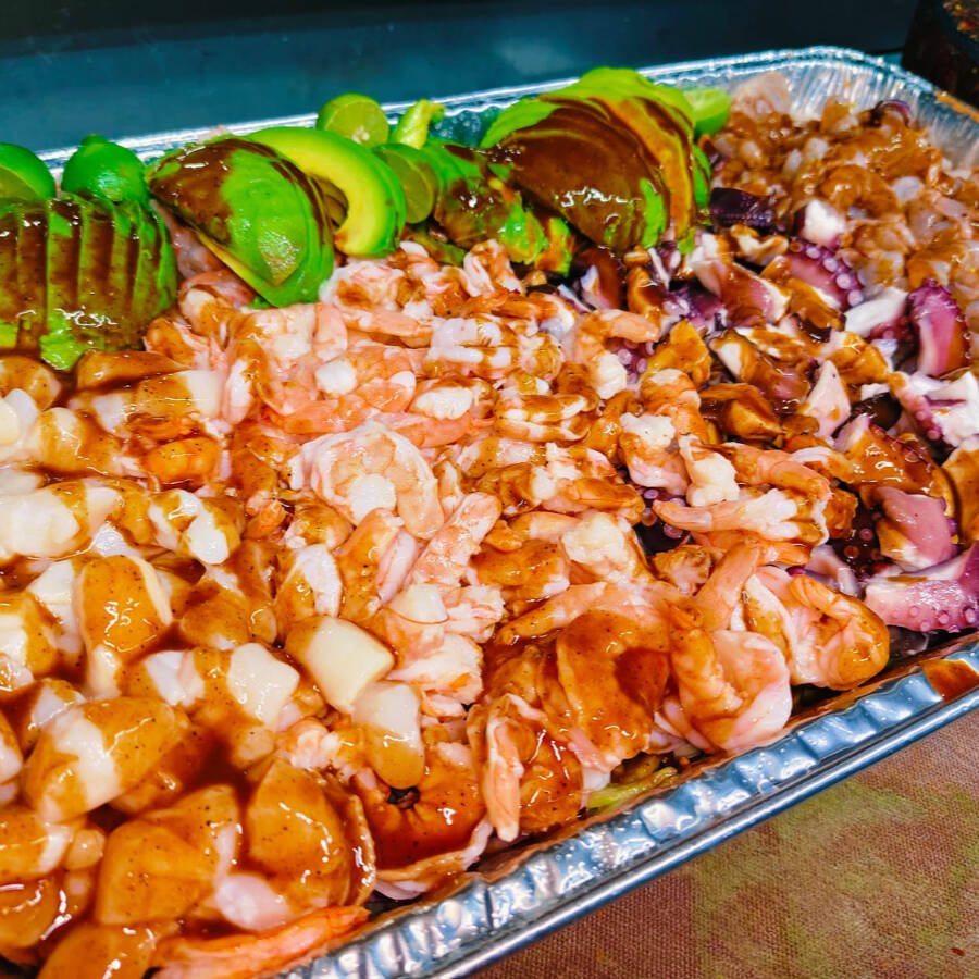 Aguachile, camarón cocido, pulpo, medallón de Atún.