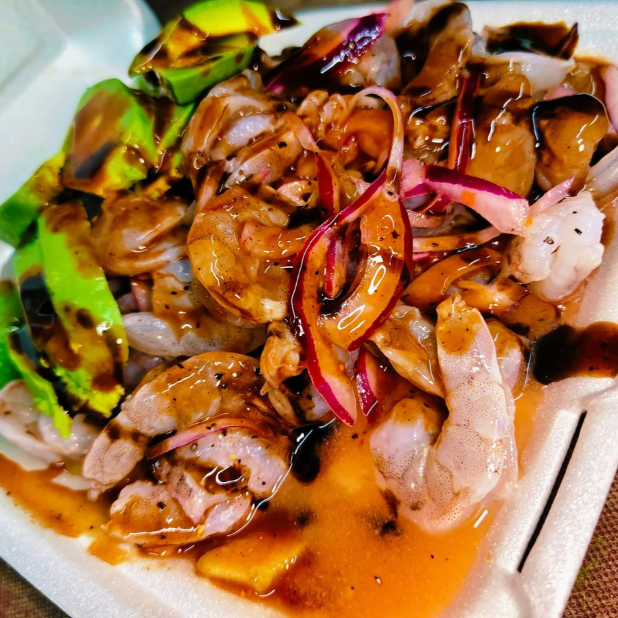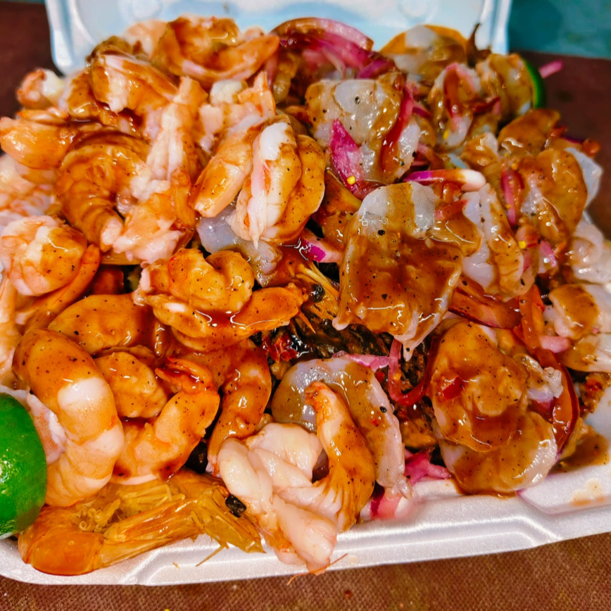Pepino, cebolla, limón, camarón crudo y puede ser cocido al gusto.