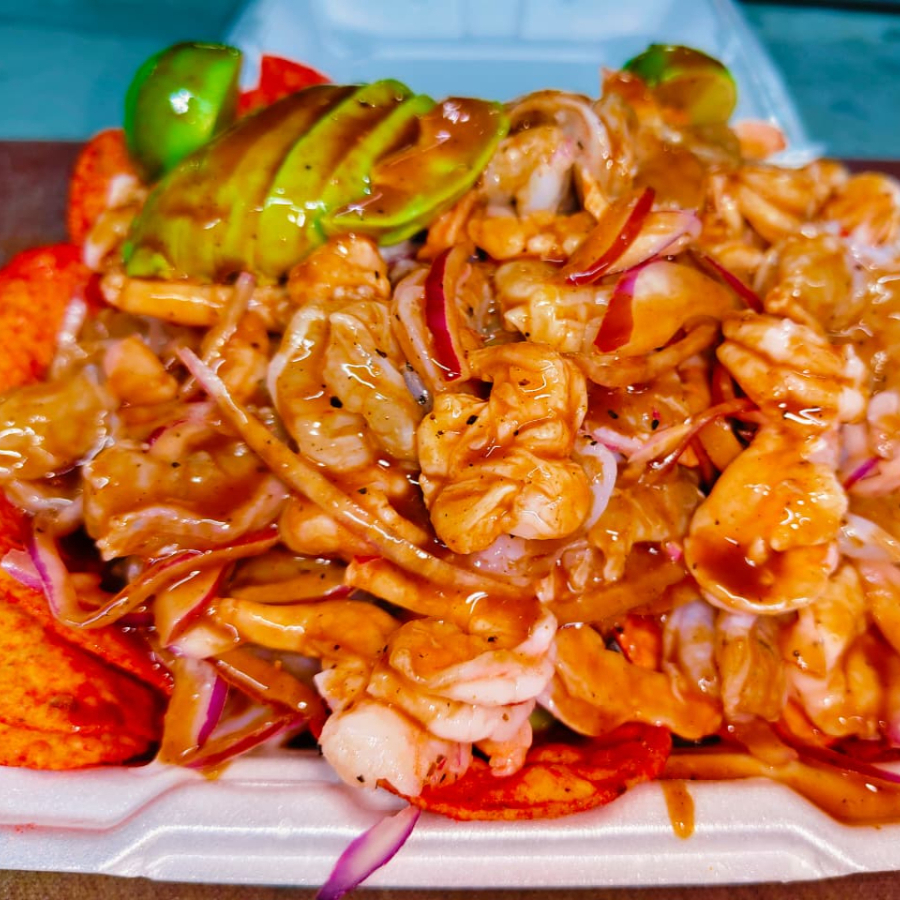 Tostitos, carne seca, camarón seco, aguachile y camarón cocido.