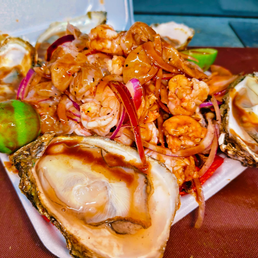 Tostitos, carne seca, aguachile mixto, pata de mula en concha y ostiones en concha.