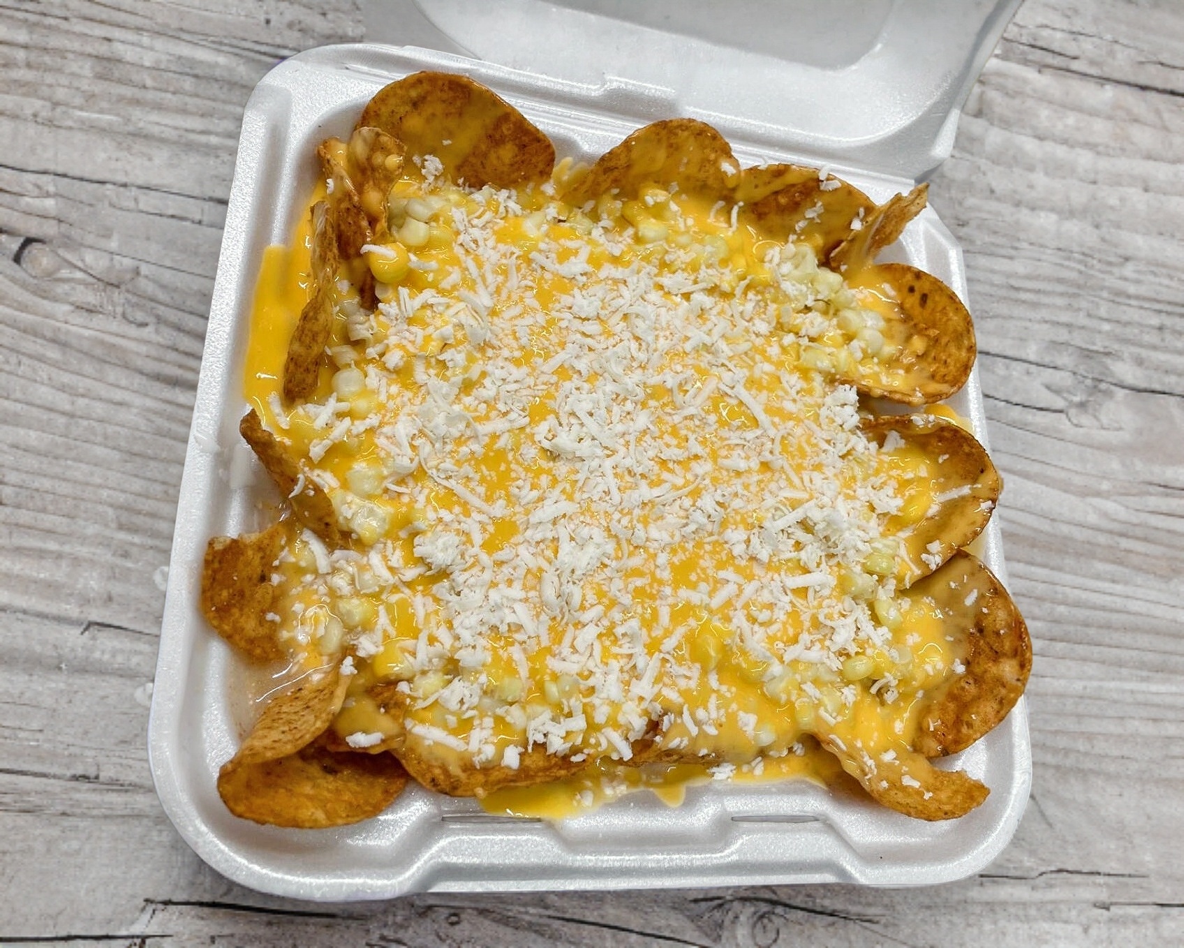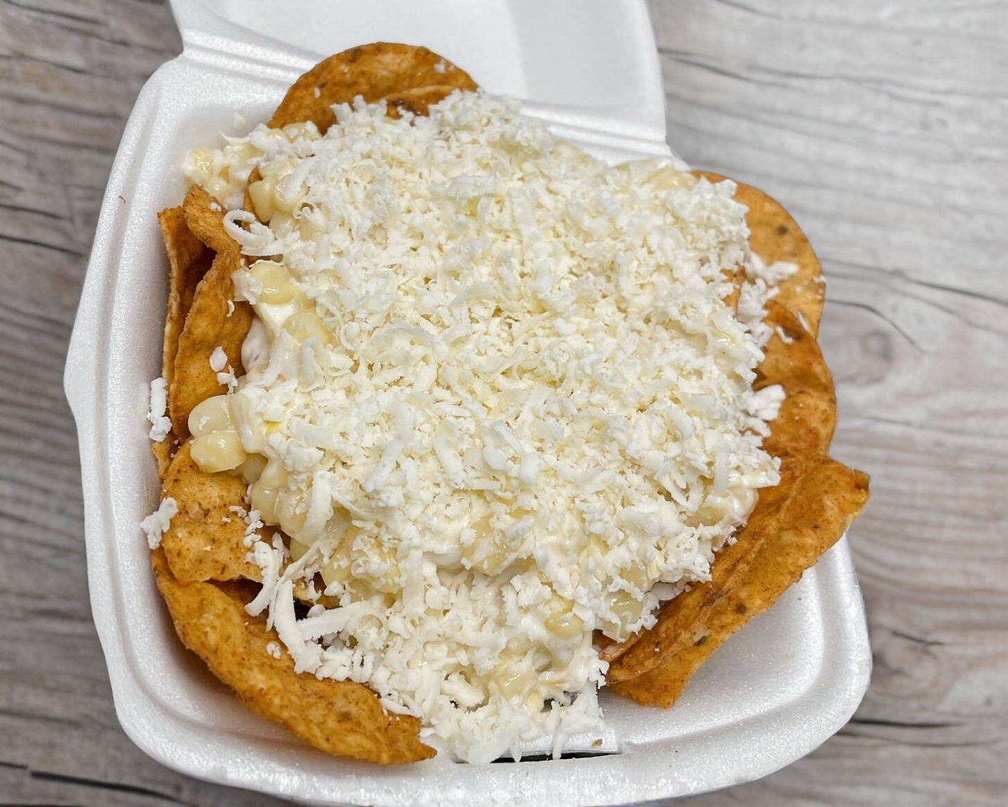 Una bolsa de Tostitos chica en una charola pequeña con la porción de un elote de 8oz con mantequilla, mayonesa, limón y queso seco