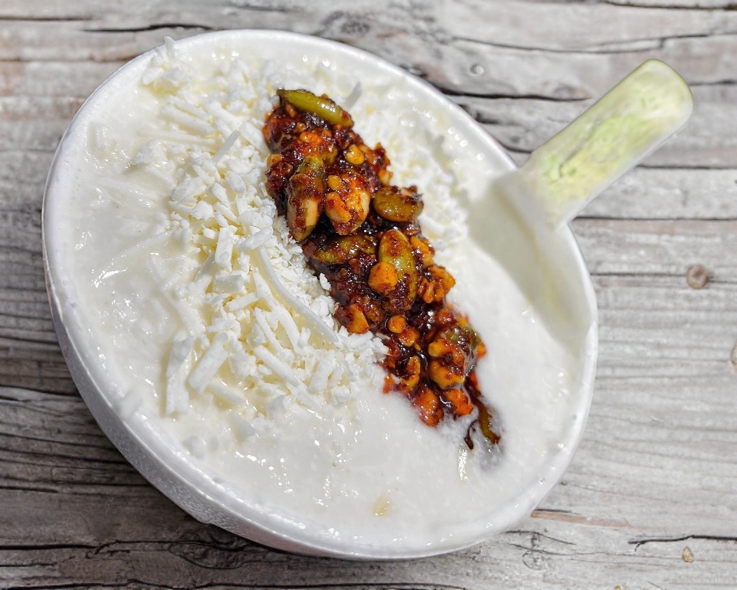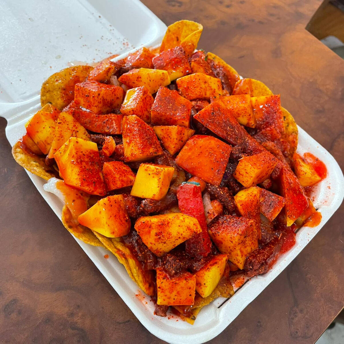 Pepino, jícama, cueritos, cacahuates, chaca chaca, salsas, chamoy, limon, chile en polvo y clamato