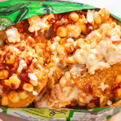 Tostitos, elote, mantequilla, mayonesa, queso cotija, limón, salsa valentina, tajín bañados de cheetos flamín hot.