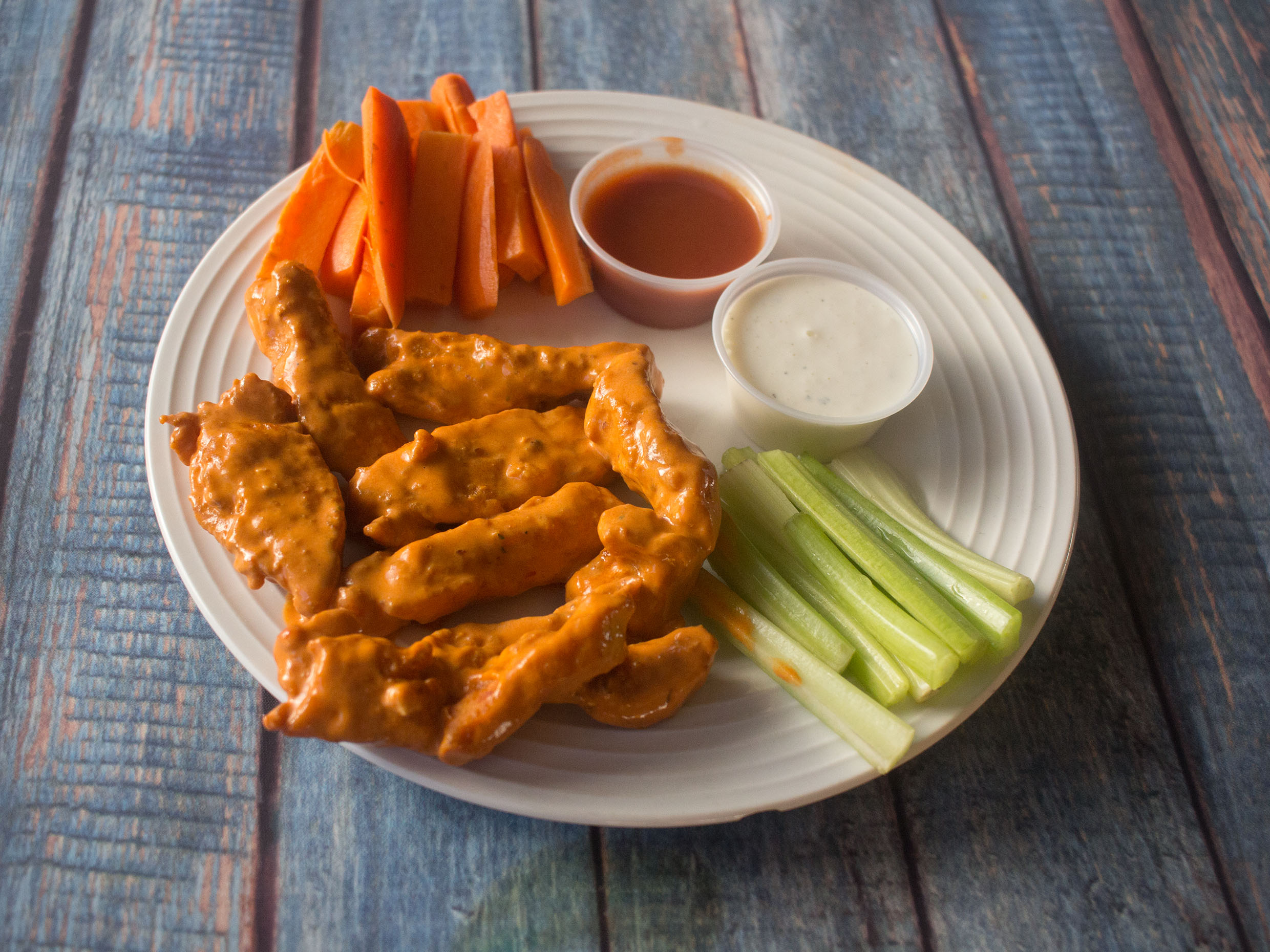 5 Tiras de Pechuga de pollo bañadas en la salsa de tu preferencia acompañadas de apio, zanahoria y aderezo ranch.