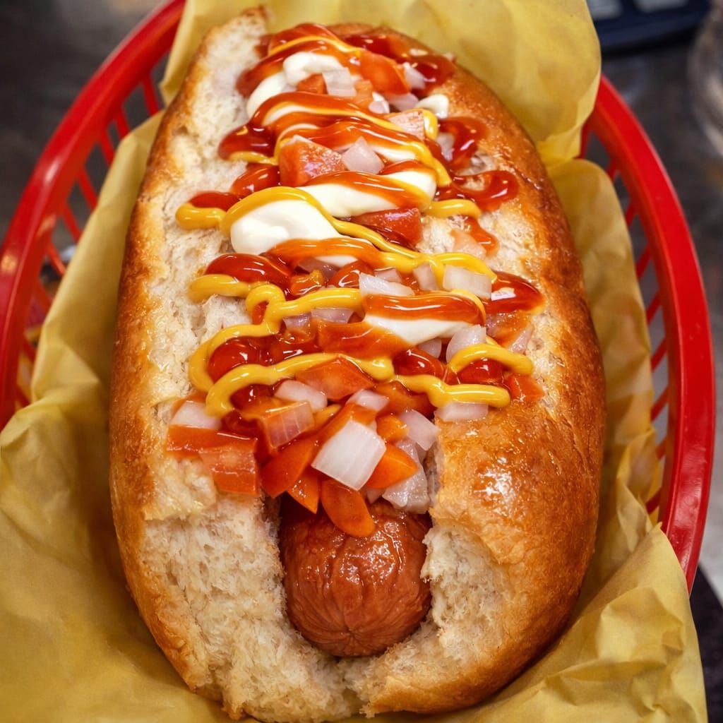 Salchicha de pavo, tocino, cebolla, tomate mayonesa, catsup, Mostaza, Pepinillos