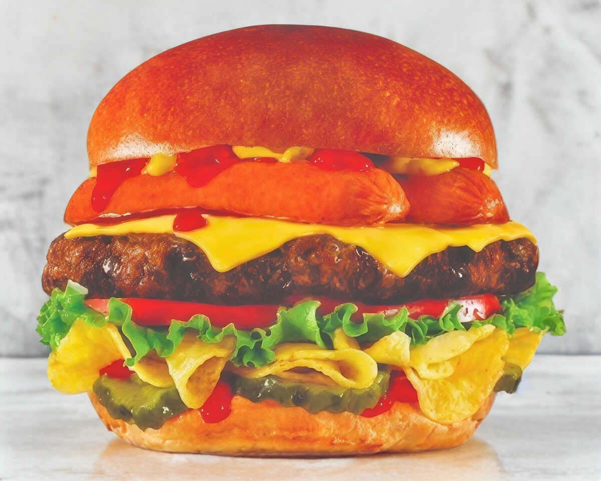 pan ,carne de res,salchicha,papas fritas (dentro de la hamburgursa),tocino,lechuga,tomate,cebolla,aderezo especial,kepchup,mostaza