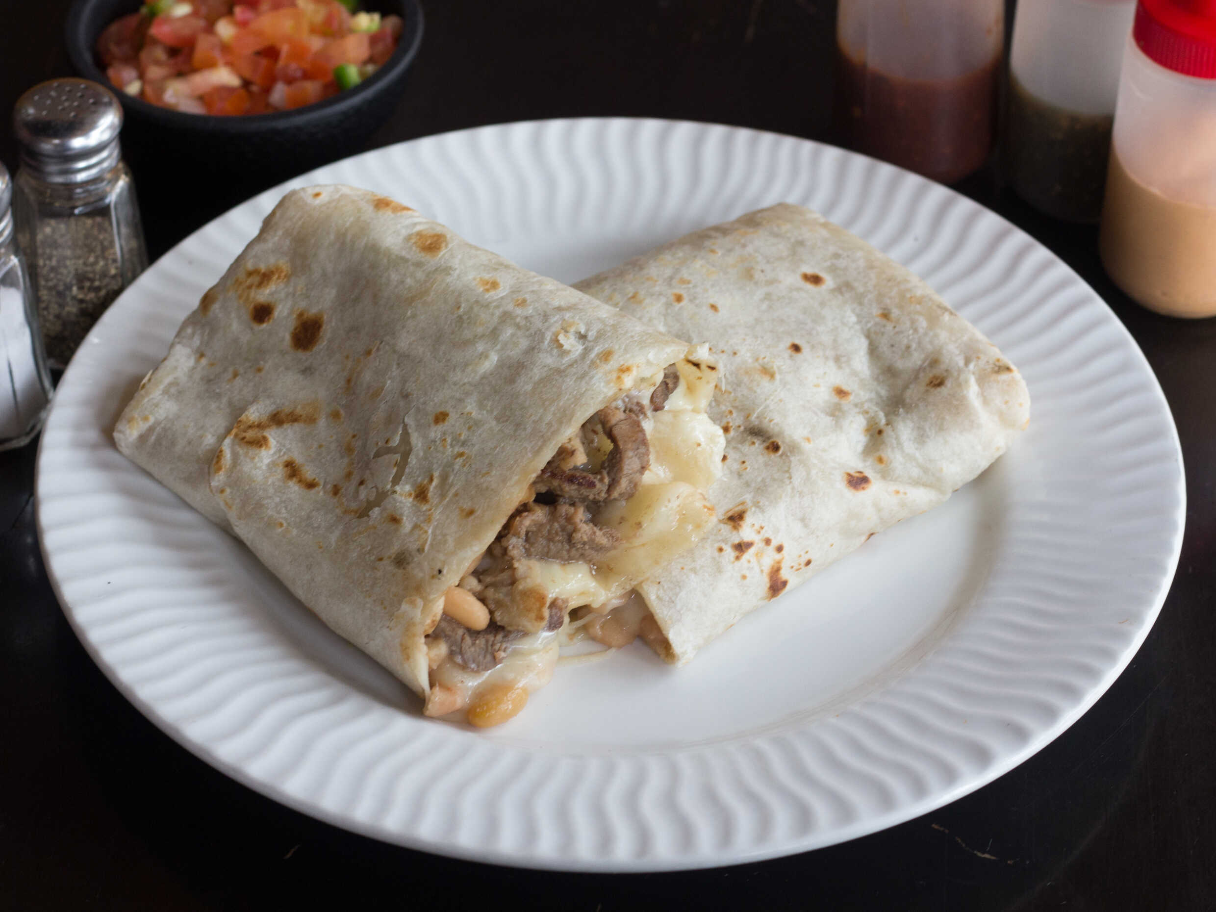 Nuestro burrote en su interior solo lleva frijoles y guisado de carne sirlon steak con chile, mas la tortilla es de 40cm, tortilla sobaquera queremos que tengas una rica experiencia al comerlo. Se sirve con salsa bandera y 2 de 3 salsas picantes a escoger. No incluye otra cosa.