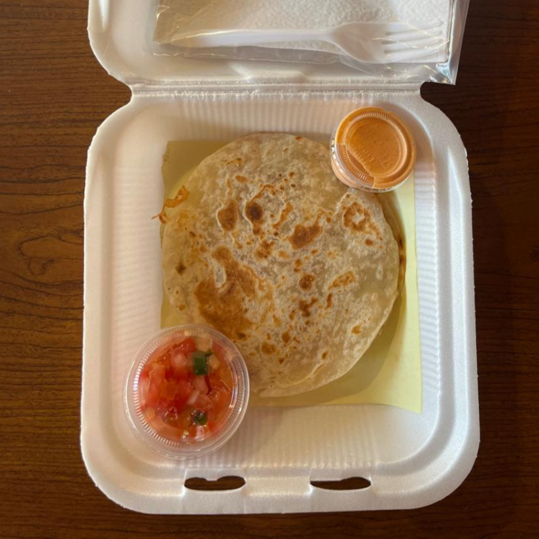 Quesadilla lleva queso y carne adobada, la tortilla es de 15cm. Se entrega con salsa bandera 2 oz y 1 salsa picante a elegir. no incluye otra cosa.