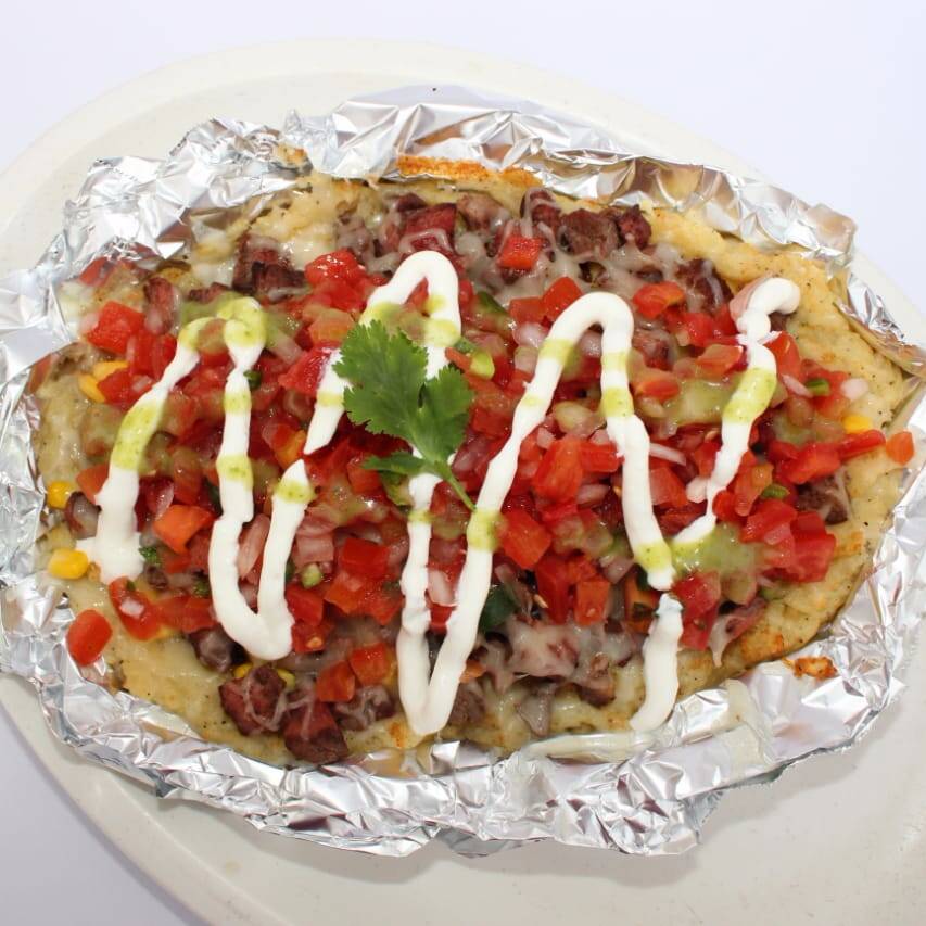 Pure de papa horneado, se le agrega carne asada sirloin steak, granos de elote, champinones, queso asadero, se hornea para gratinar, se entrega salsa bandera, salsa chipotle y 3 tortillas de 6pulgadas. no incluye otra cosa mas