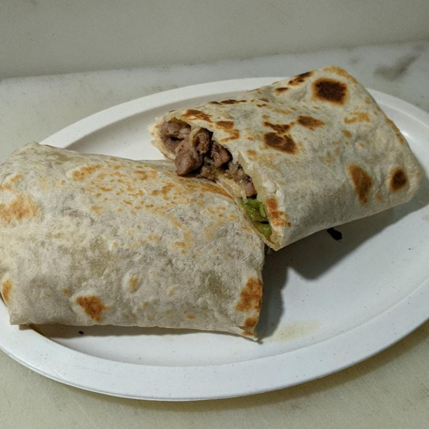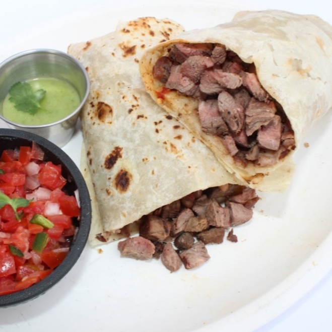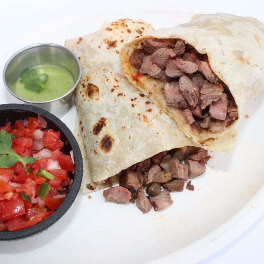 Burrote en su interior lleva frijoles y guisado de bisteck ranchero, mas la tortilla es de 40cm. Se entrega con 2 salsas picantes a escoger. No incluye otra cosa.