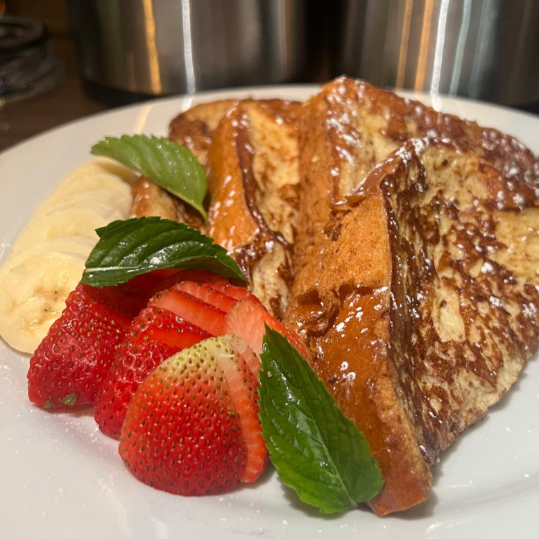 pan frances dulce acompañado de queso cottage o crema batida y de fruta a eleccion