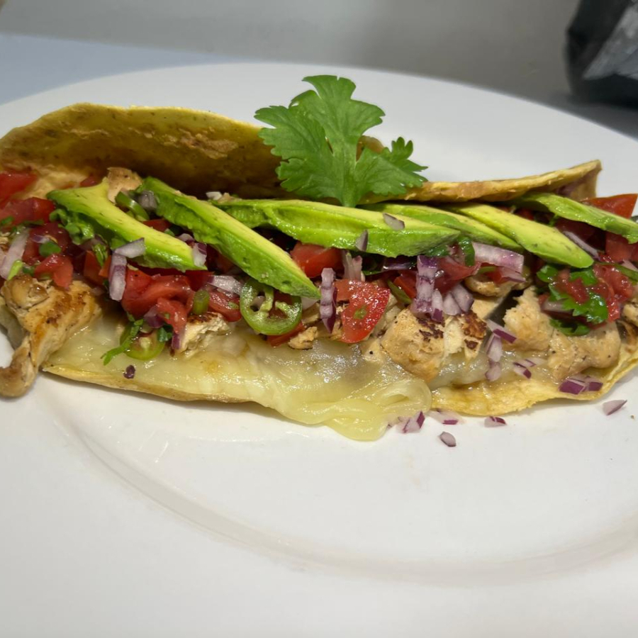 2 tortillas de maiz gratinadas con queso mozarella, frijol refrito, pechugade pollo salsa bandera (cebolla, tomate, cilantro y chile serrano picado) y aguacate,