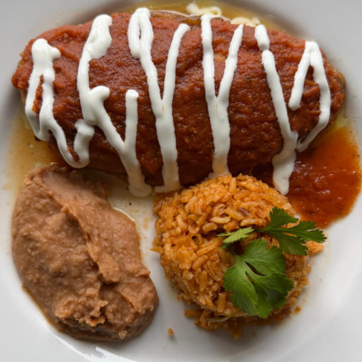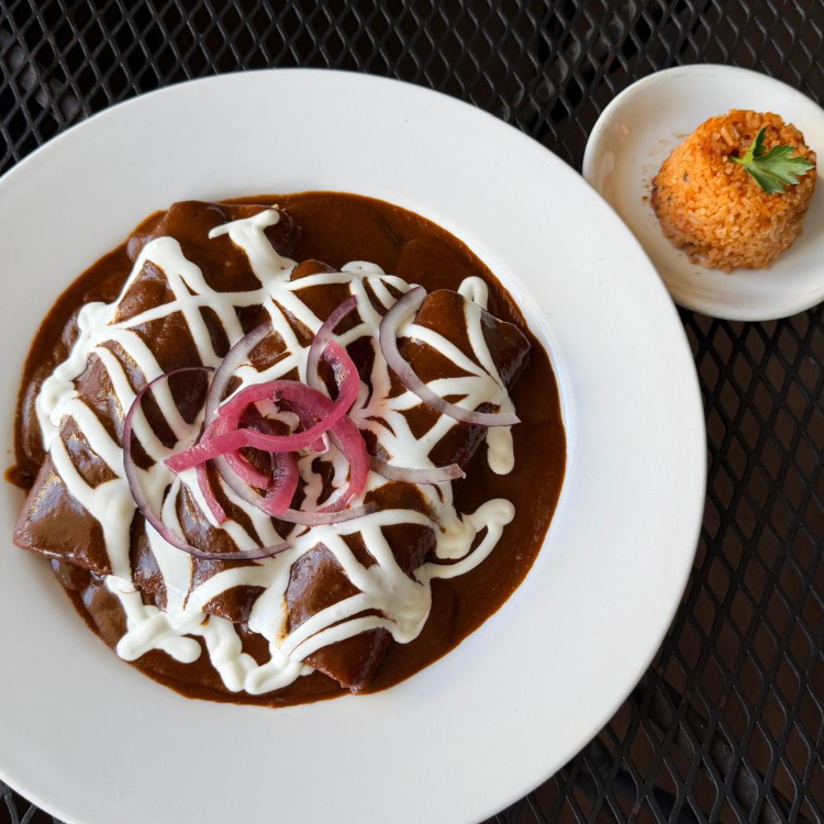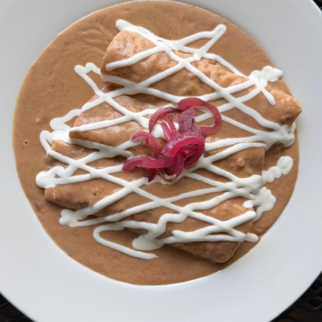 3 tortillas de maiz hechas en casa rellenas de queso o pechuga de pollo, bañadas en mole y crema, acompañadas de arroz rojo o frijol refrito.