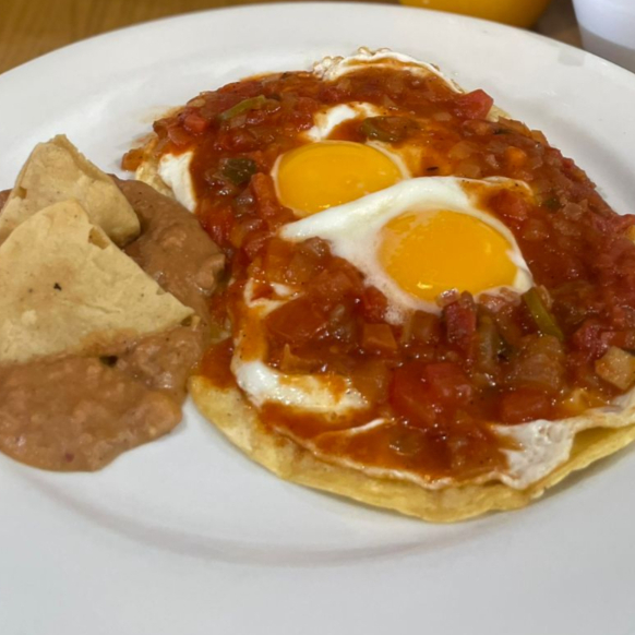 huevos estrellados al gusto, con tortilla de maiz tostada bañados en salsa ranchera, acompañados de frijol refrito.
