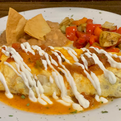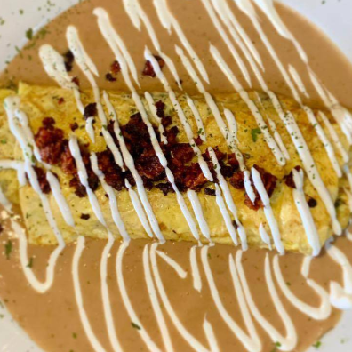 tortilla de huevo rellena con Pollo, queso mozzarella bañado en salsa chipotle, acompañado de frijol refrito y papa campesina