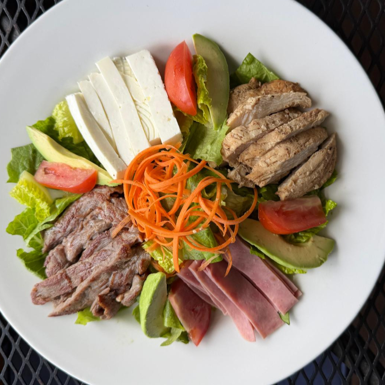 mix de lechugas con tomate en cascos, aguacate, queso panela, zanahoria, jamon de pavo, acompañado de arrachera y pechuga de pollo con aderezo a eleccion.