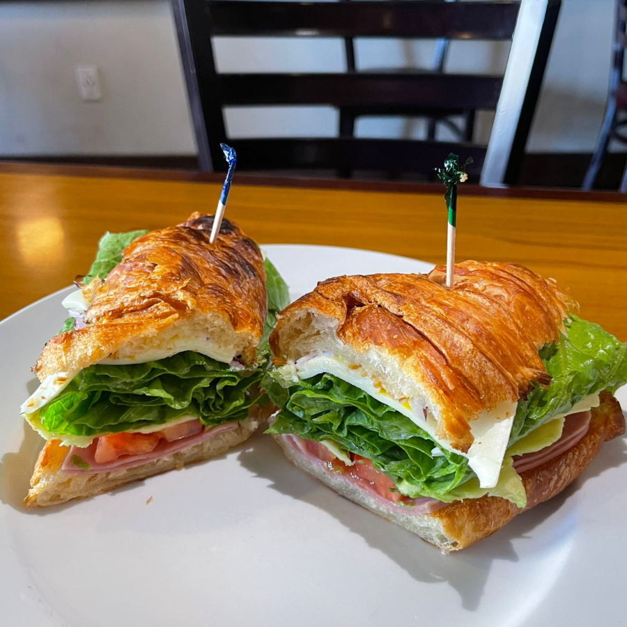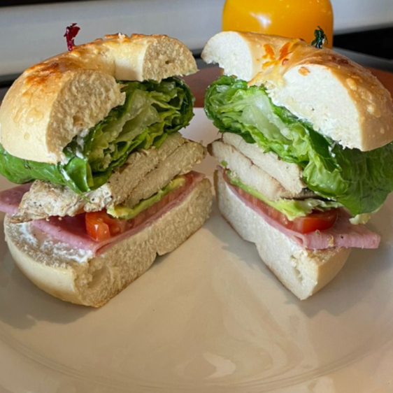 Pan blanco de queso parmesano, aderezado con queso crema, jamon de pavo, tomate, aguacate, lechuga romana.
