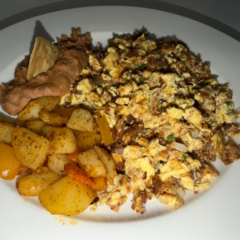 huevos revueltos con machaca de sonora con tomate cebolla y chile serrano, acompañados de frijol refrito y papa campesina
