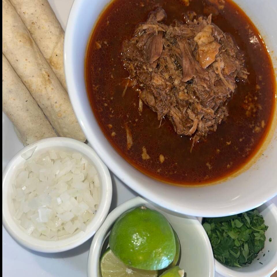 Vaso de 22 onz con jugosa birria de res cocida lentamente con especias acompañado de cebolla picada, cilantro, limón Tahití, salsa chile de árbol y tortillas de maiz.