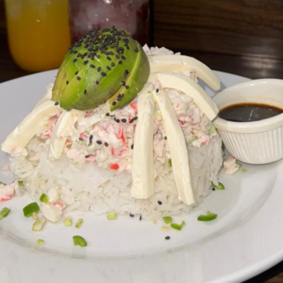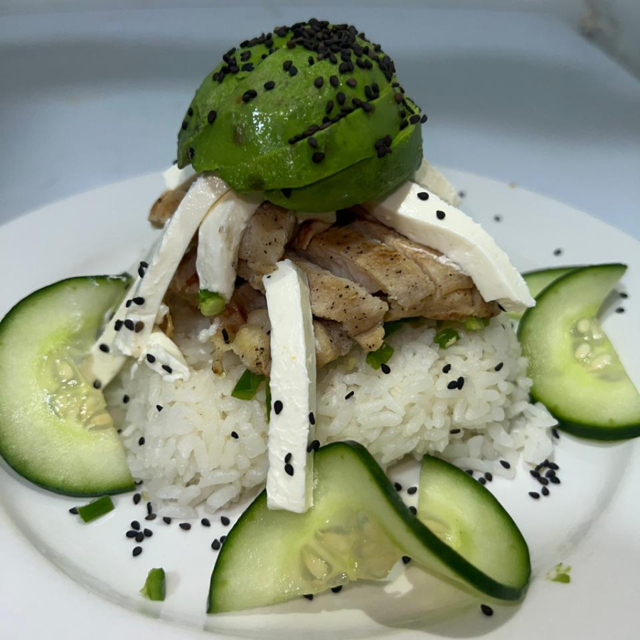 Arroz blanco con pechuga mezquite o teriyaki, queso crema, aguacate, chile serrano y ajonjoli negro