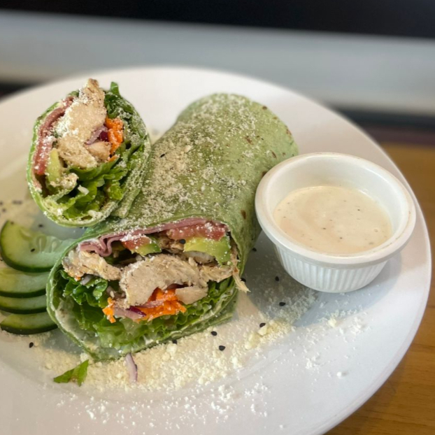tortilla de espinaca aderezada con Queso Crema philadelphia, jamon de pavo, tomate, aguacate, zanahoria rayada, pechuga de pollo, lechuga romana, aderezo a eleccion