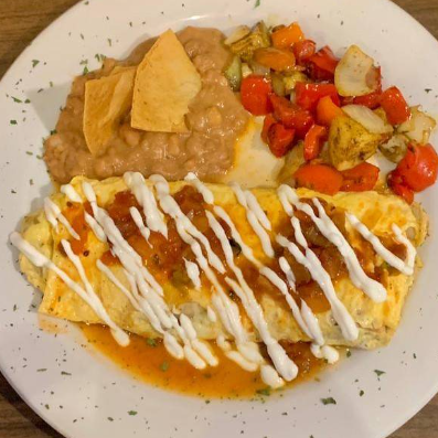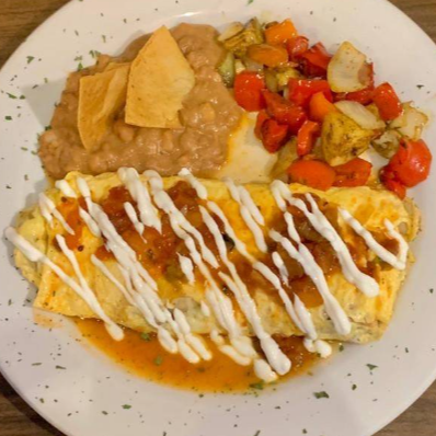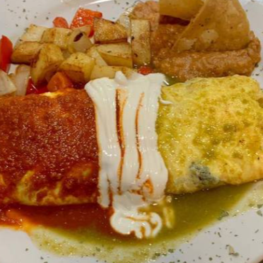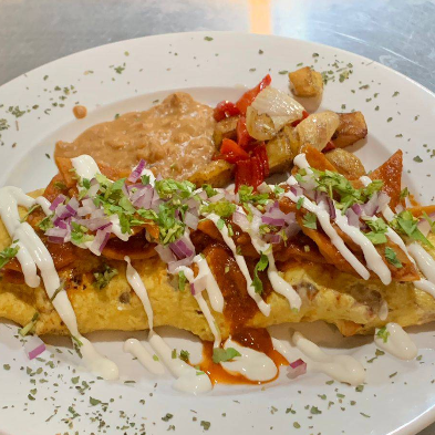 Omelet relleno de chilaquiles al gusto ( chipotle,rojos, verdes o mole) con queso mozarella con guarnición de papa campesina y frijol refrito
