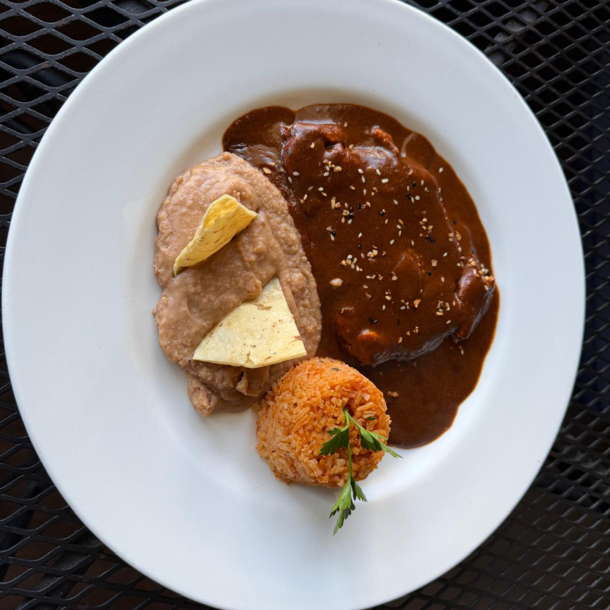 Pechuga de pollo asada, bañada en mole acompañada de frijol refrito, arroz rojo y tortillas a elejir