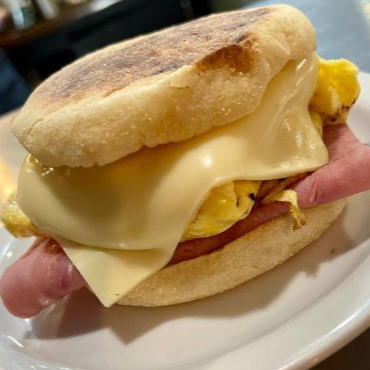 pan de english con tortilla de Huevo, Jamon de Pavo y queso americano-suizo.