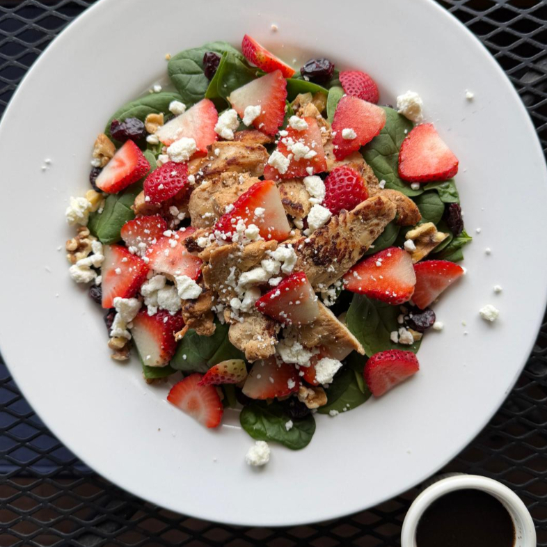 Mix de espinacas con fresa, nuez, queso feta y vinagreta, con pechuga de pollo mezquite
