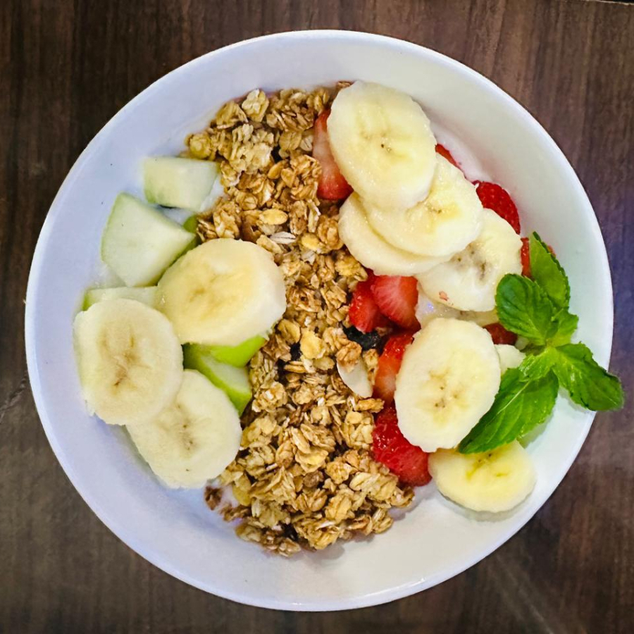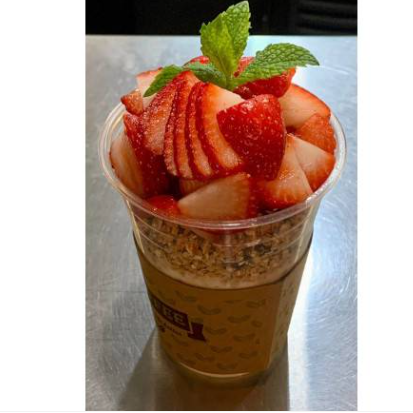 Yogurt natural sin sabor, granola, fruta de temporada y miel de abeja.