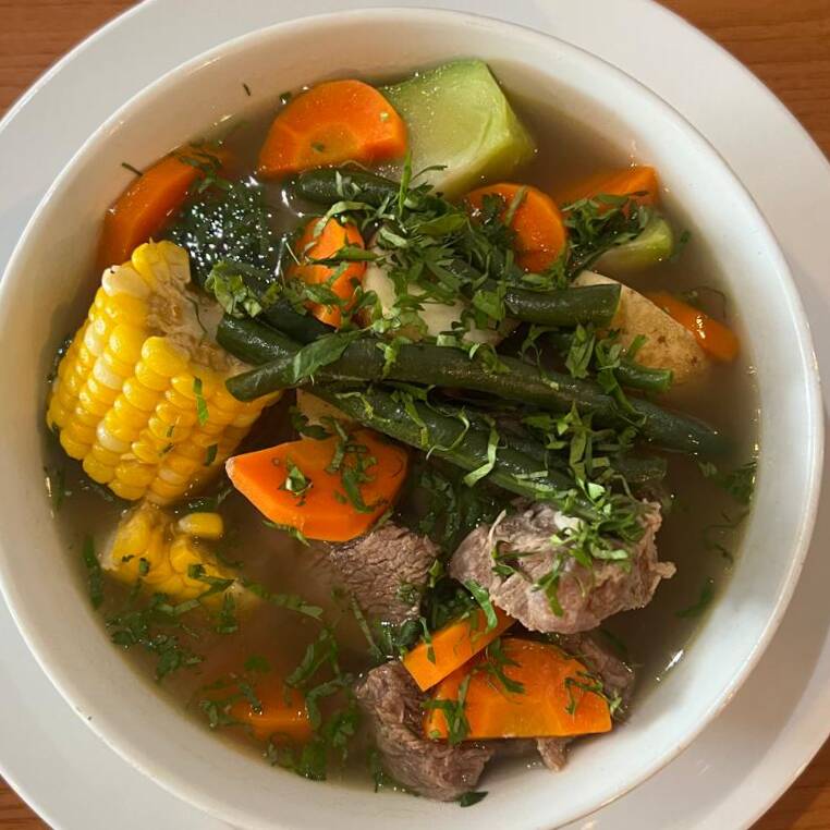 Caldo de res con vegetales (ejote,zanahoria, papa, chayote, elote, cilantro y hueso) acompañado de tortilla de maiz o arroz rojo.