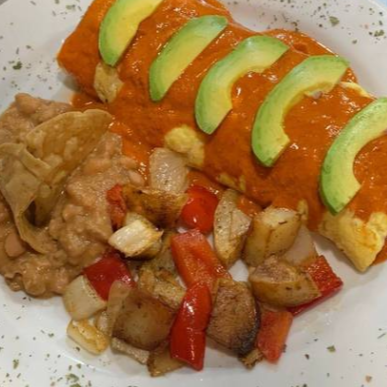 tortilla de huevo relleno de Queso Mozarella, Cebolla y Rajas Poblanas, acompañada de frijol refrito y papa campesina