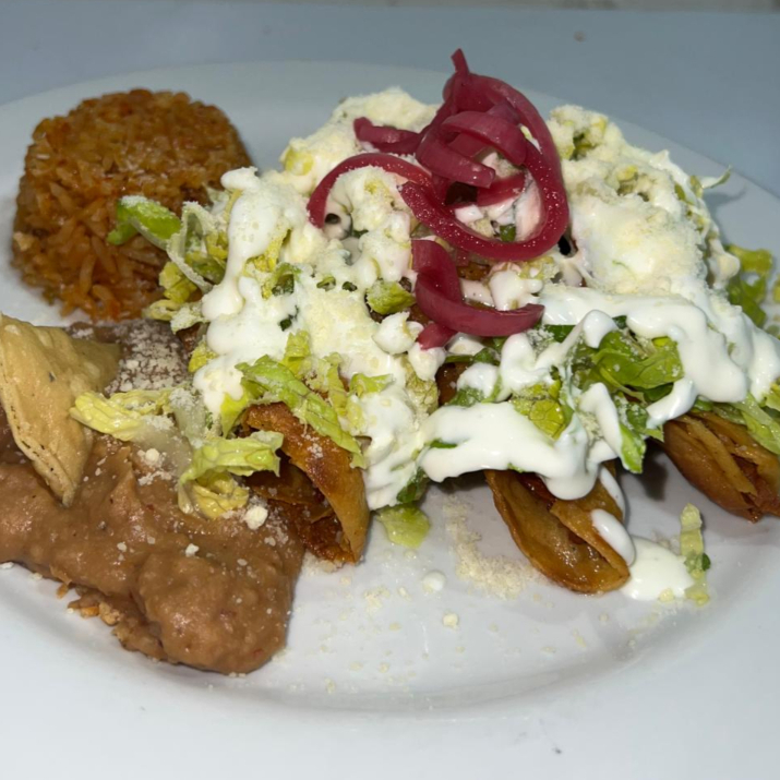 Tacos dorados con pechuga de pollo al mezquite o papa machacada, con tortilla de maiz artesanal, acompañado de arroz rojo y frijol refrito.