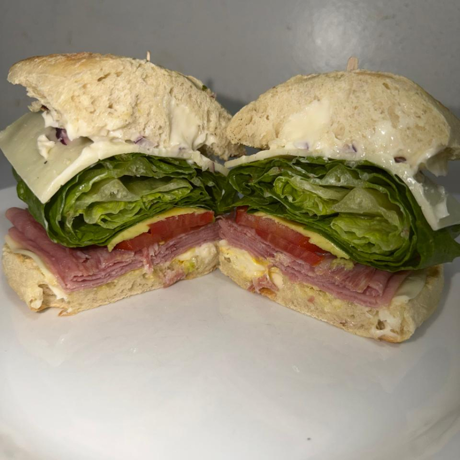 Pan ciabatta tostado aderezado de mayonesa y mostaza, acompañado de queso gouda, doble jamon pavo, salami, tomate, aguacate, lechuga, cebolla morada y queso americano.