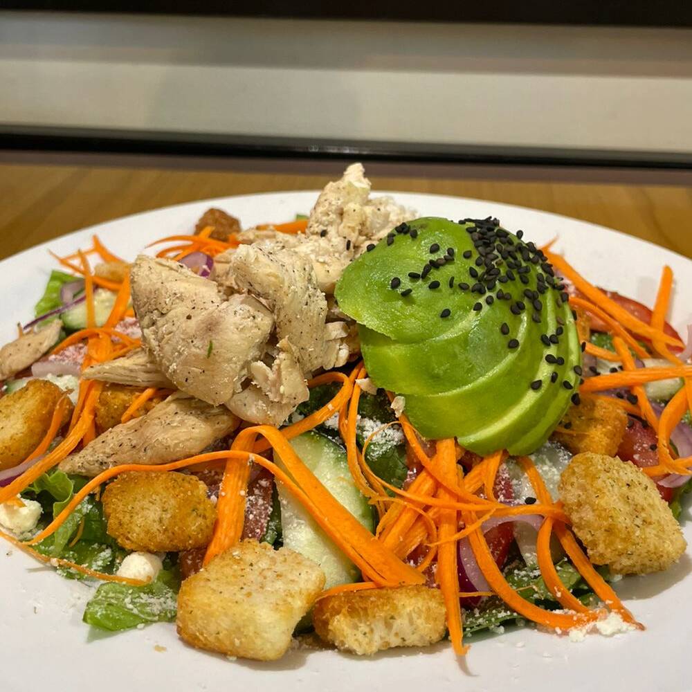 Mix de lechuga con tomate, cebolla, pepino cohombro, zanahoria rayada, crotones de pan italiano, pechuga de pollo mezquite y aguacate, aderezo a eleccion