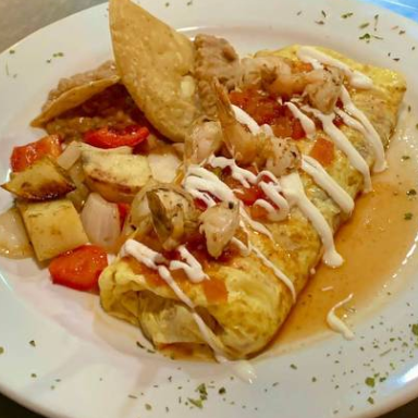 tortilla de huevo rellena con cebolla, tomate, chile serrano, camarones, queso mozzarella acompañada de frijol refrito y papa campesina