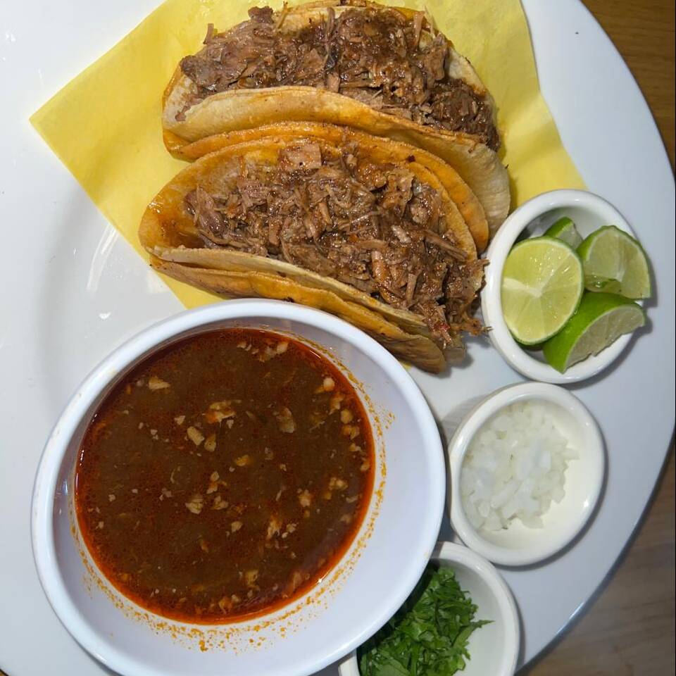 2 Tacos de birria de res con tortilla de maiz, acompañada con vaso de consomé 8 onz, cilantro, cebolla picada y limón tahiti.