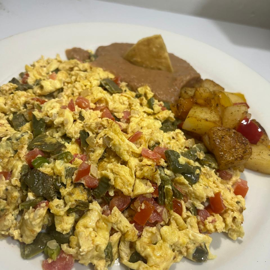 huevos revueltos con 2 ingredientes a eleccion, acompañados de frijol refrito y papa campesina con tortilla a elejir