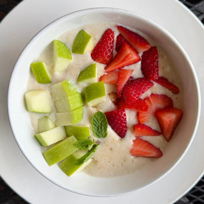 avena caliente en hojuelas, acompañada de fruta a eleccion.